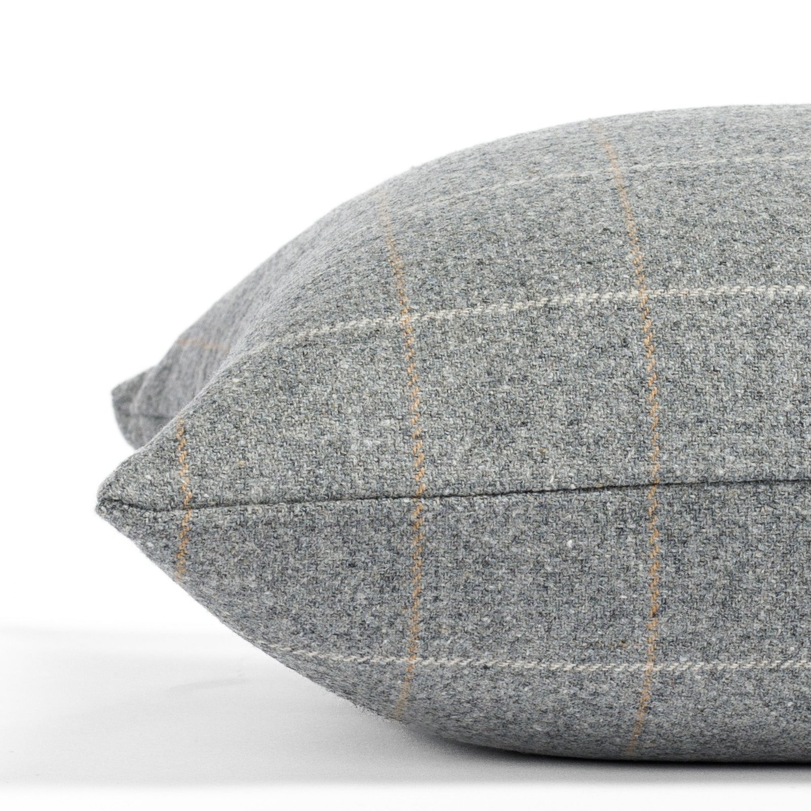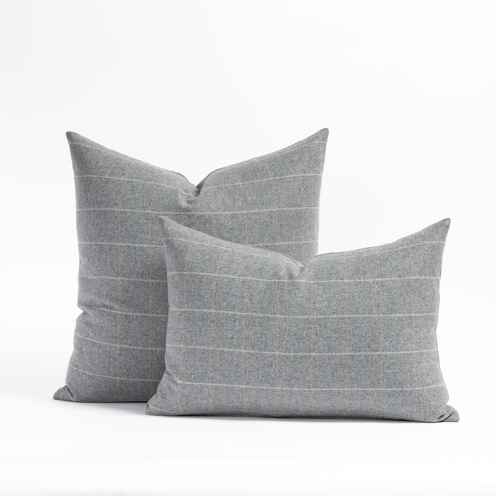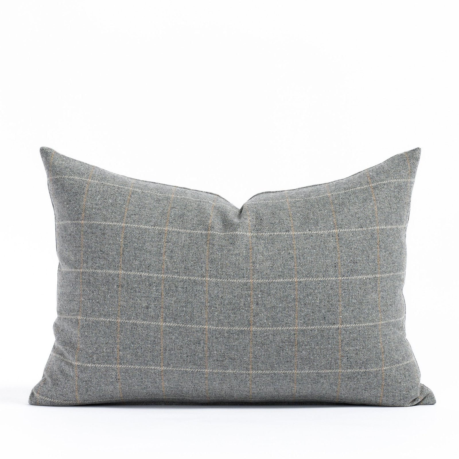 Bring home the essence of a rustic yet refined English country lodge with this charming heather grey lumbar pillow. Crafted from a soft wool-blend fabric, it features a classic windowpane pattern with accents of cream and camel tones. Offering an earthy yet tailored appeal, reminiscent of a well-worn sport coat, this handsome piece effortlessly blends sophistication with a cozy, lived-in vibe.