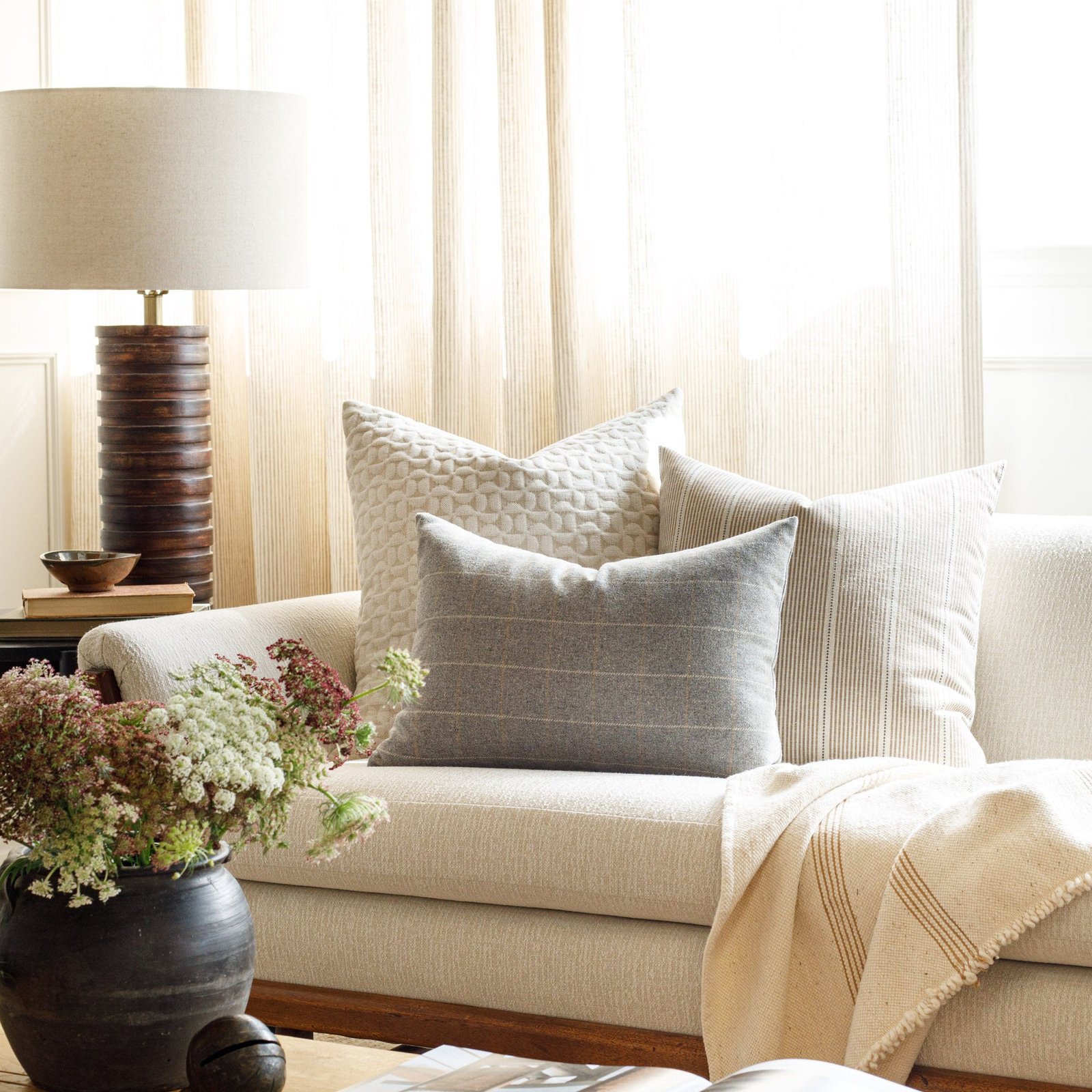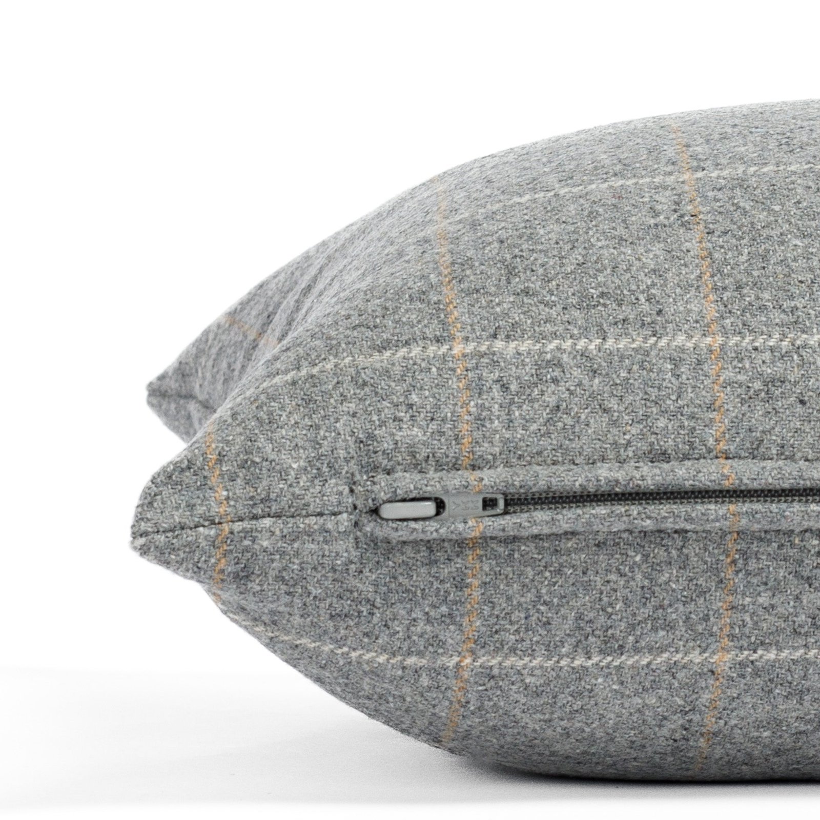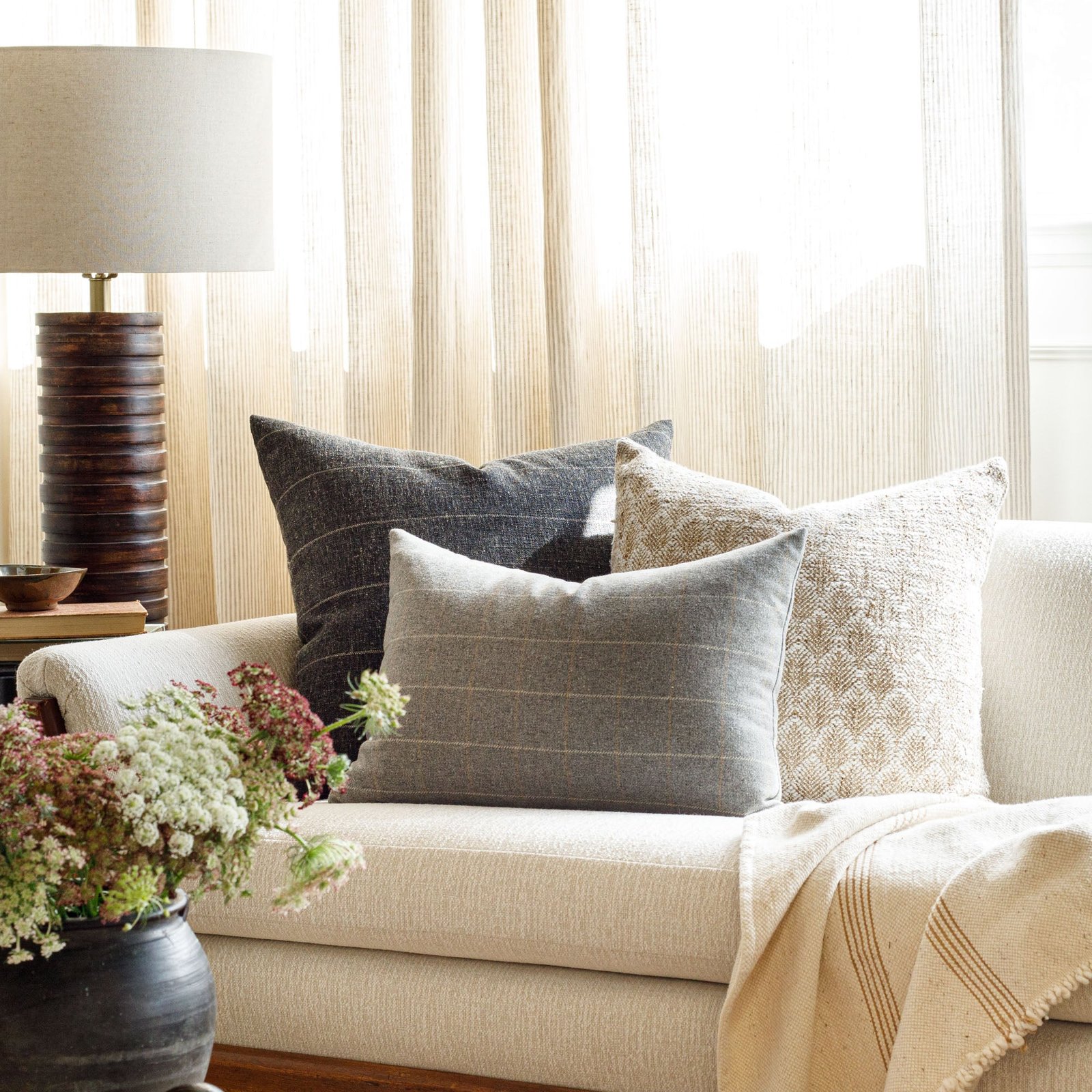 Bring home the essence of a rustic yet refined English country lodge with this charming heather grey lumbar pillow. Crafted from a soft wool-blend fabric, it features a classic windowpane pattern with accents of cream and camel tones. Offering an earthy yet tailored appeal, reminiscent of a well-worn sport coat, this handsome piece effortlessly blends sophistication with a cozy, lived-in vibe.