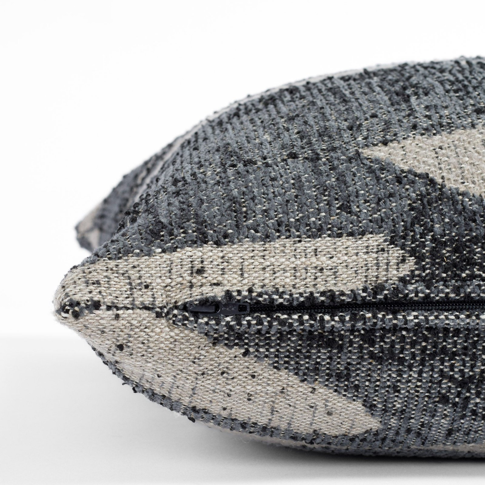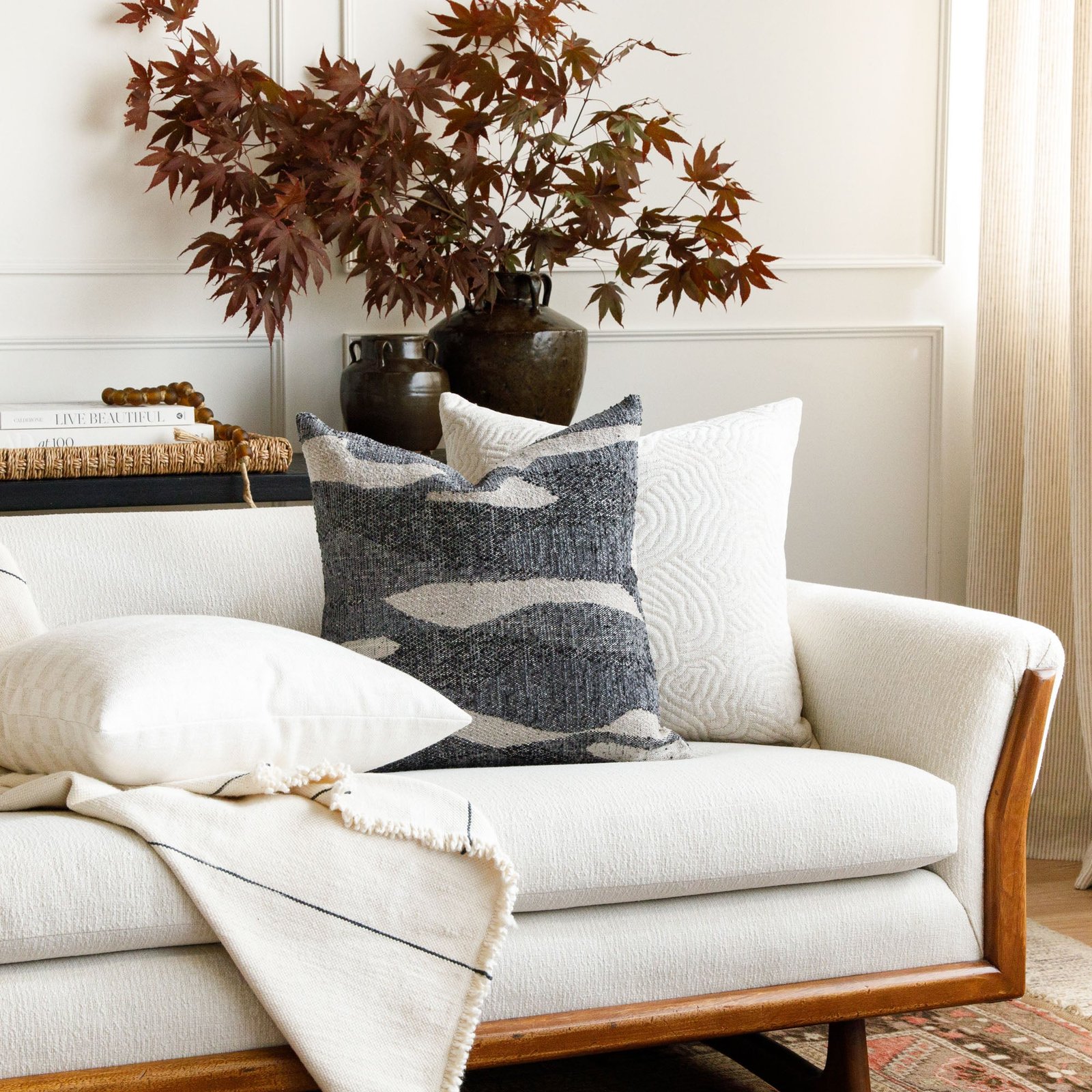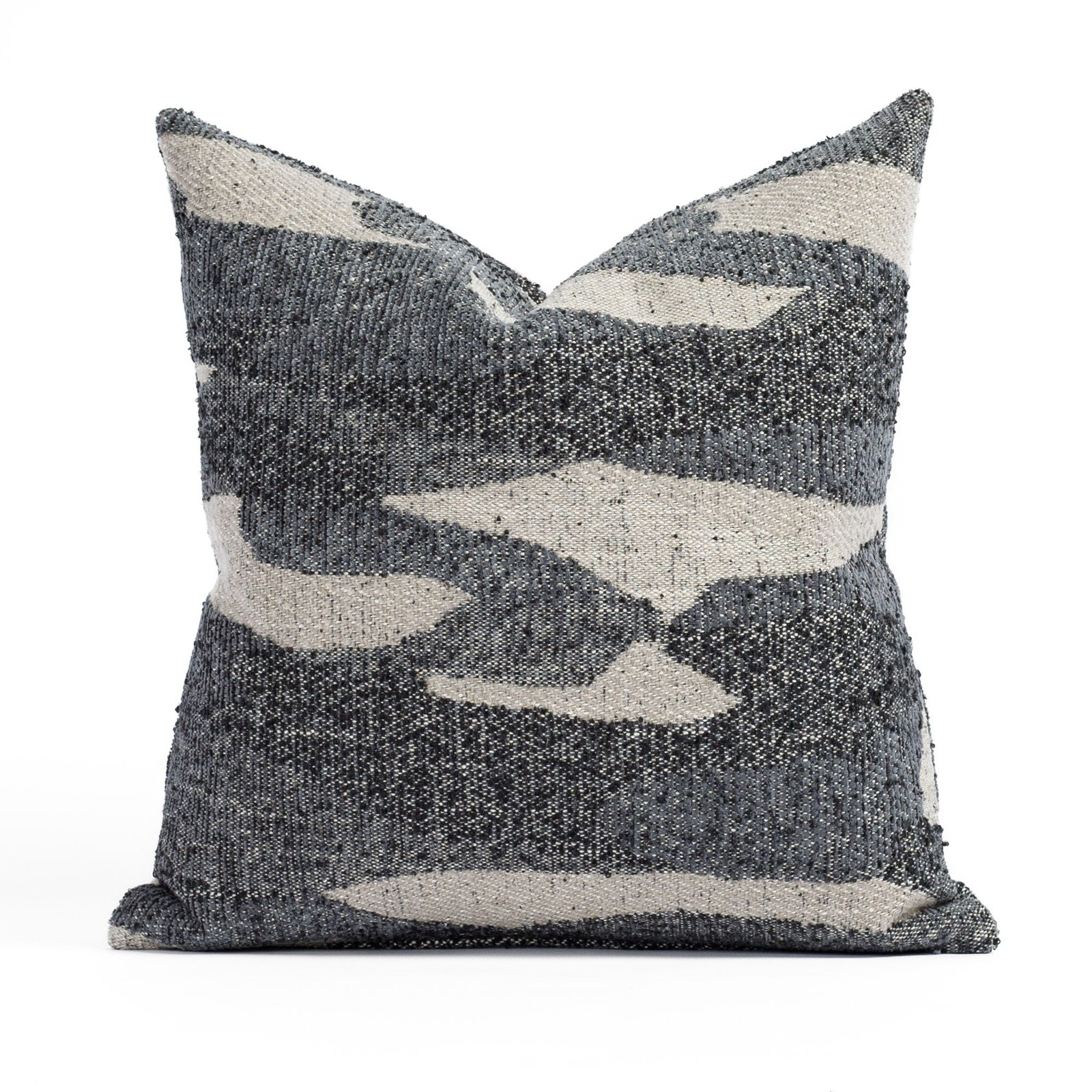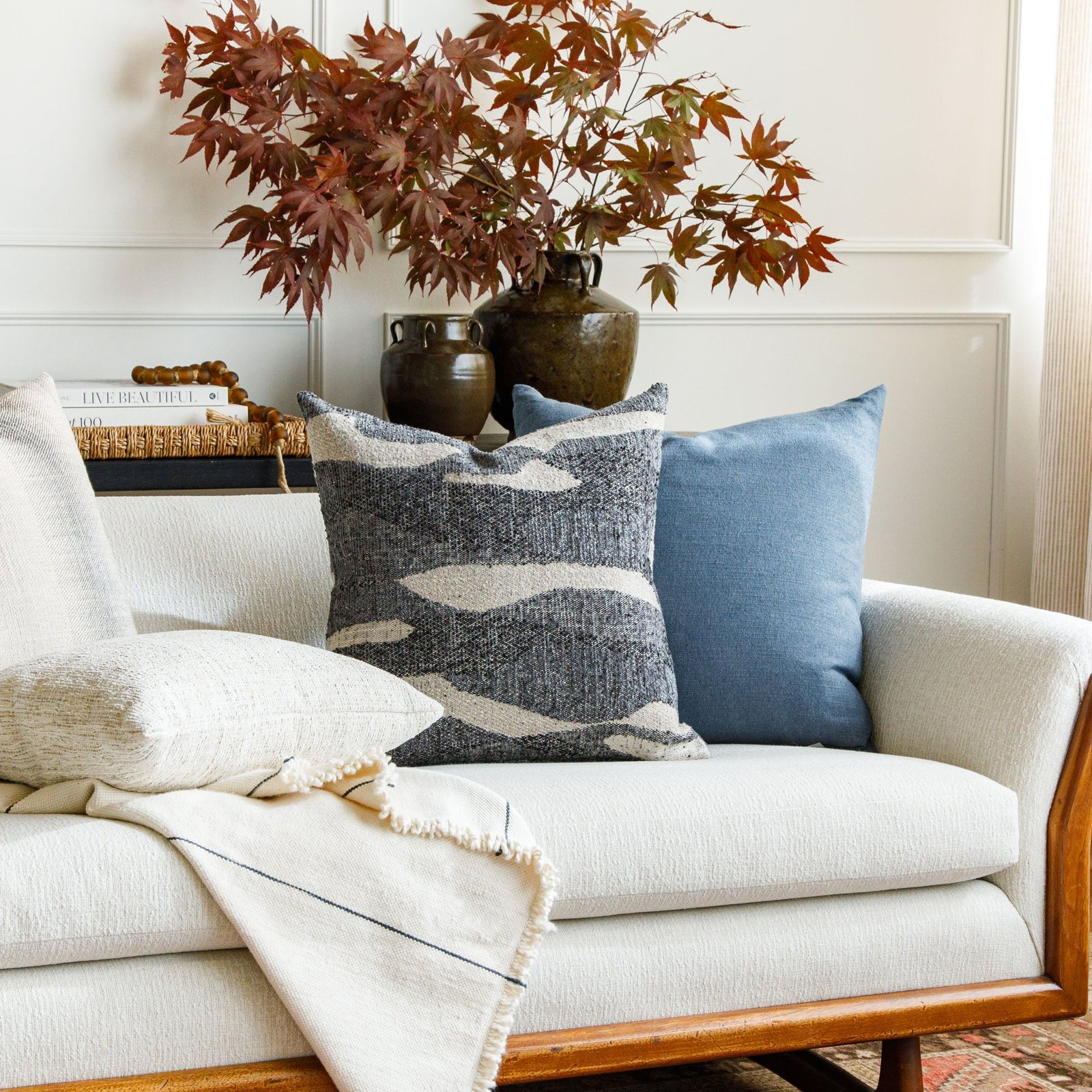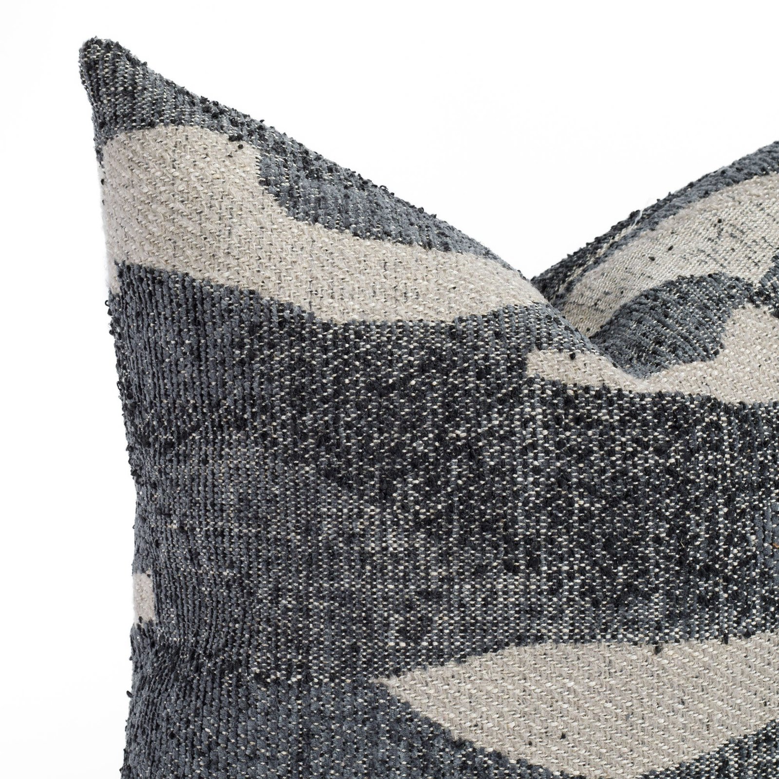 This denim blue and earthy grey pillow captivates with an oversized, organic abstract pattern. It’s a sophisticated and modern piece with a handsome motif and luxe texture that will add loads of depth and visual intrigue.