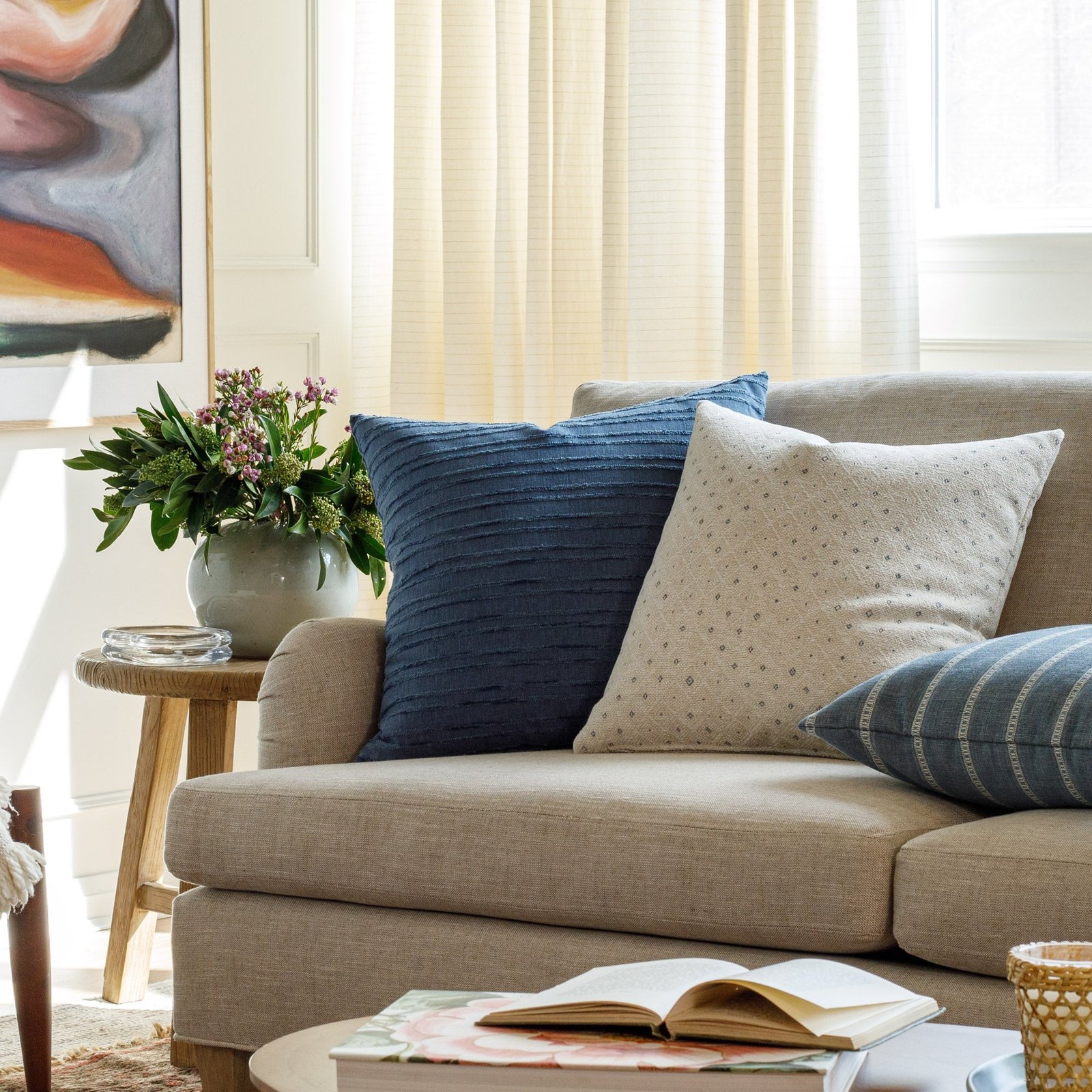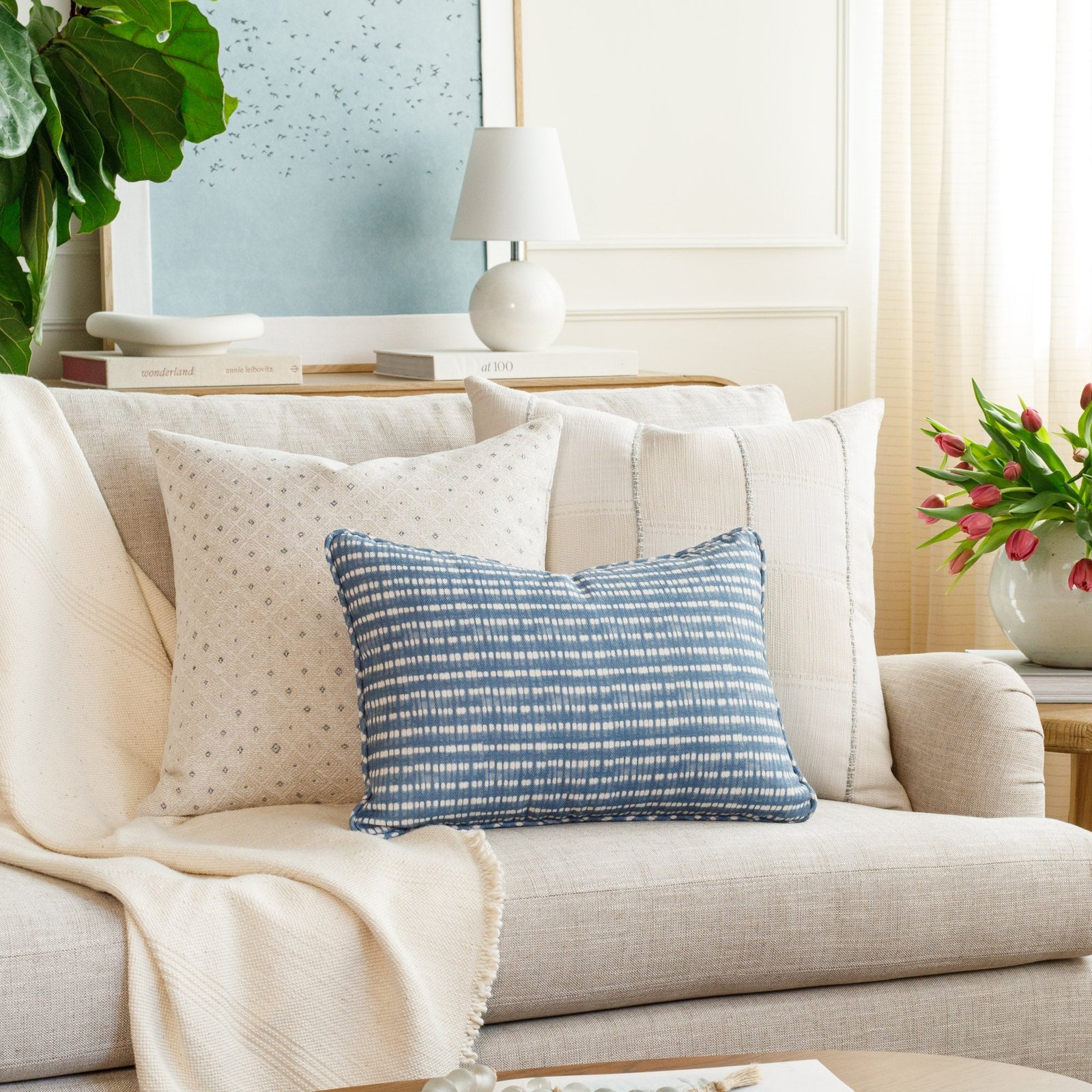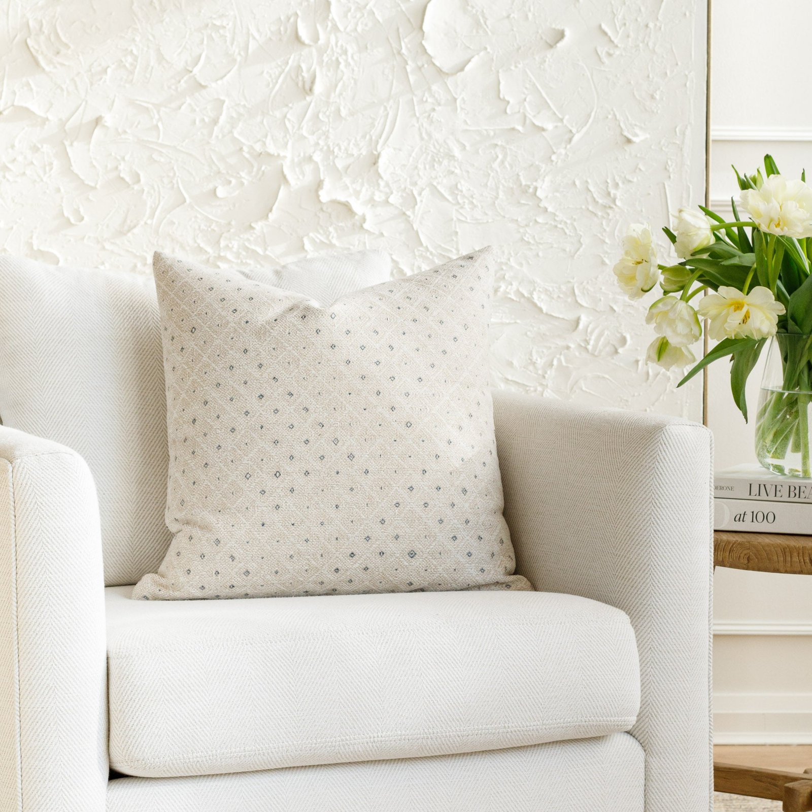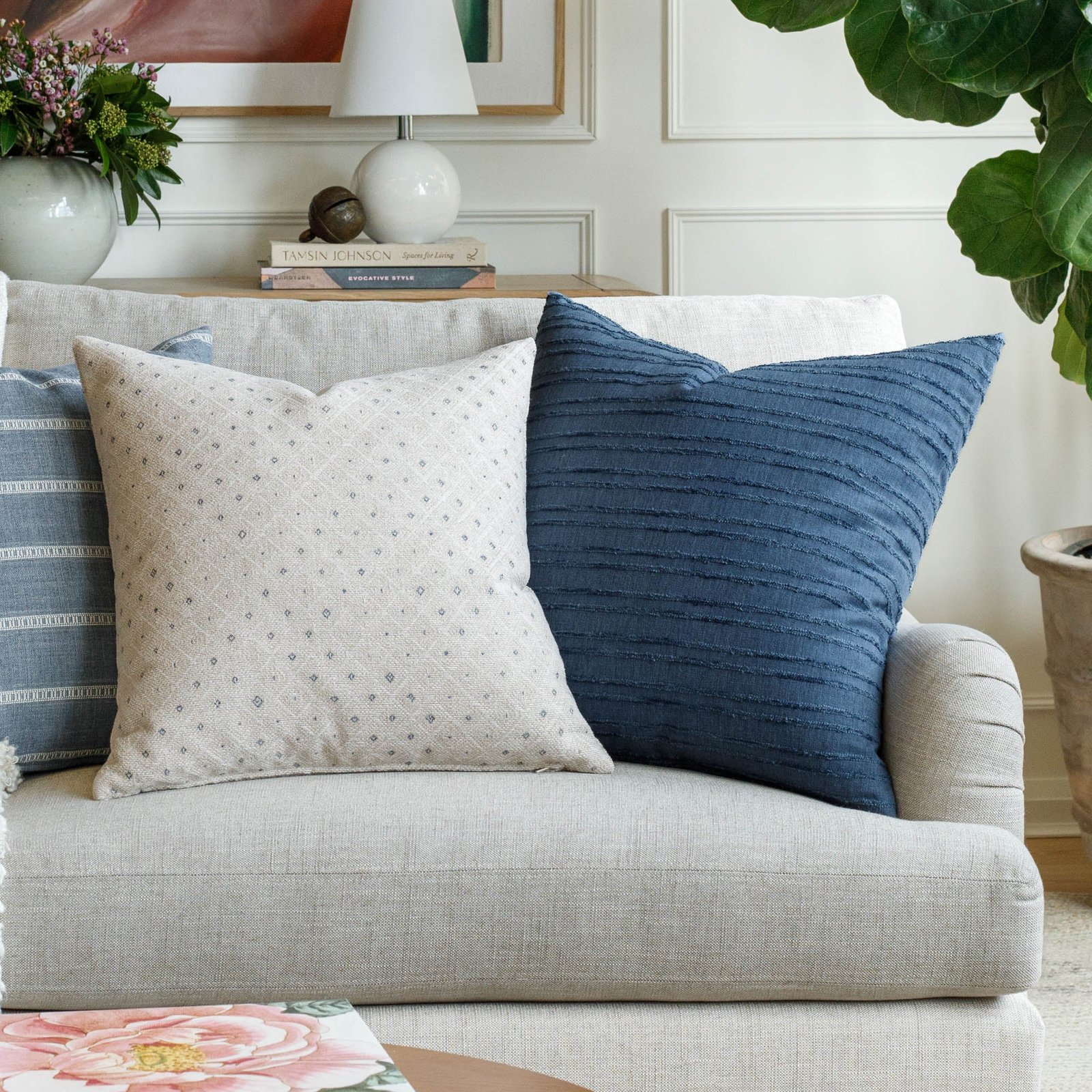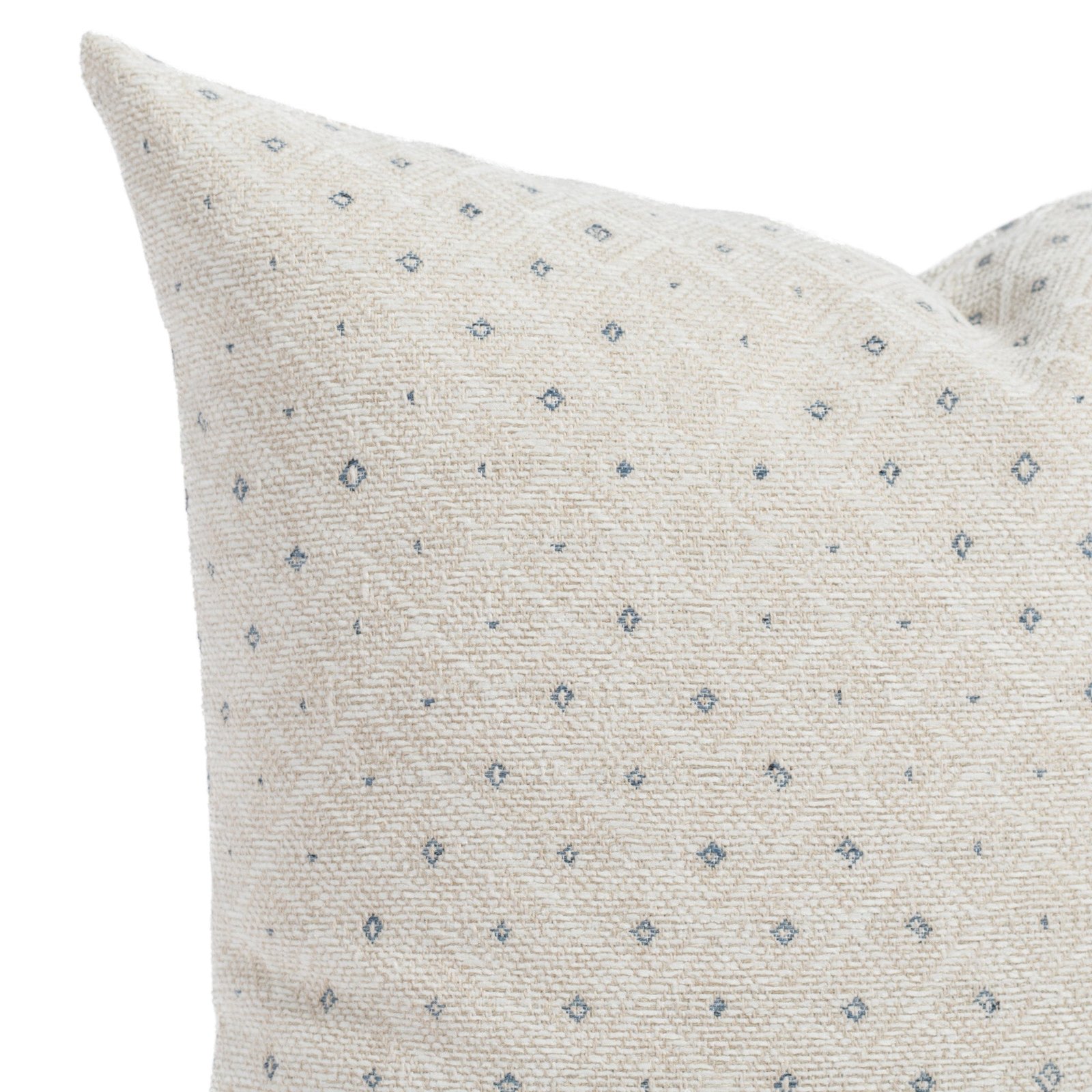 This beige and blue woven chenille pillow has an elegant diamond pattern that radiates timeless style.