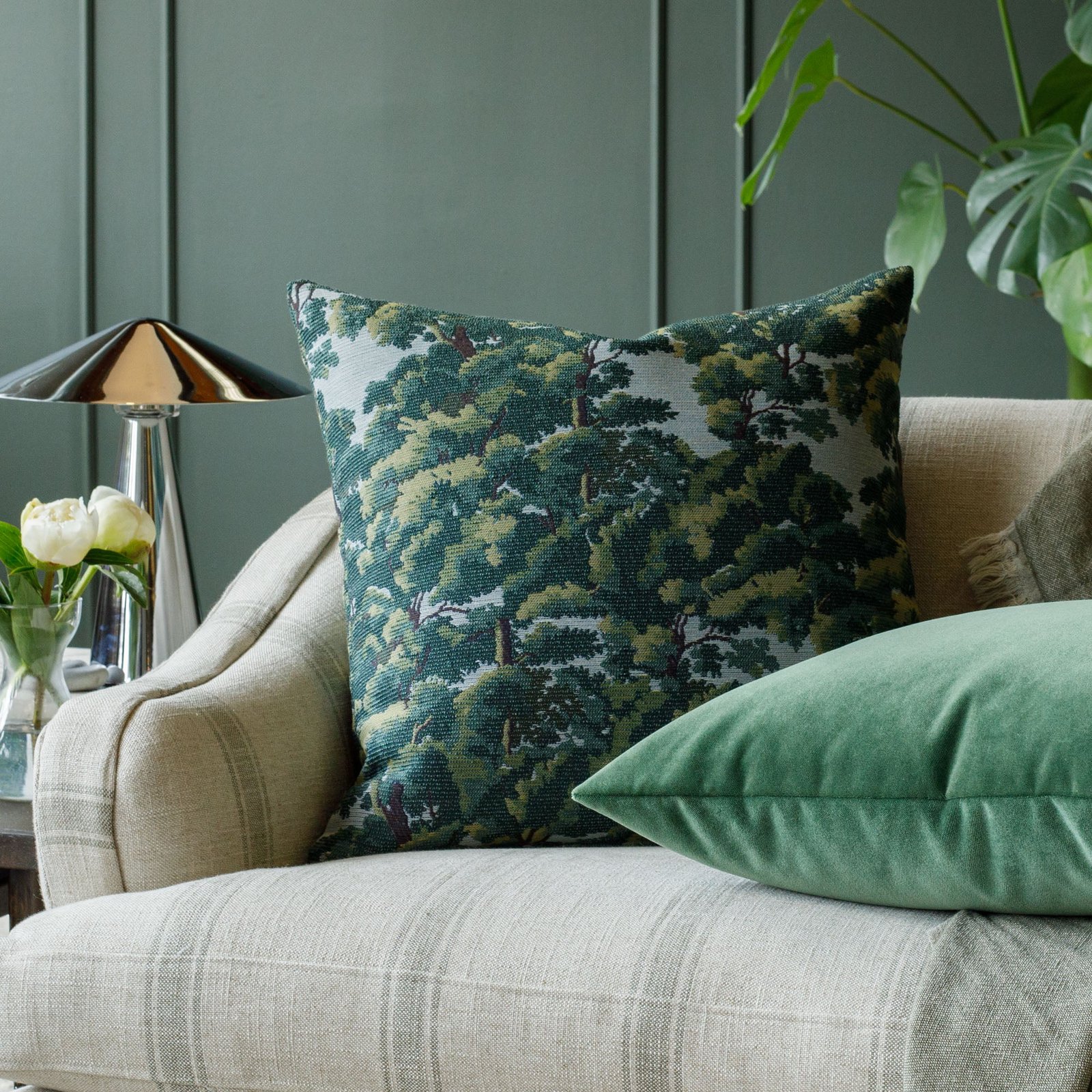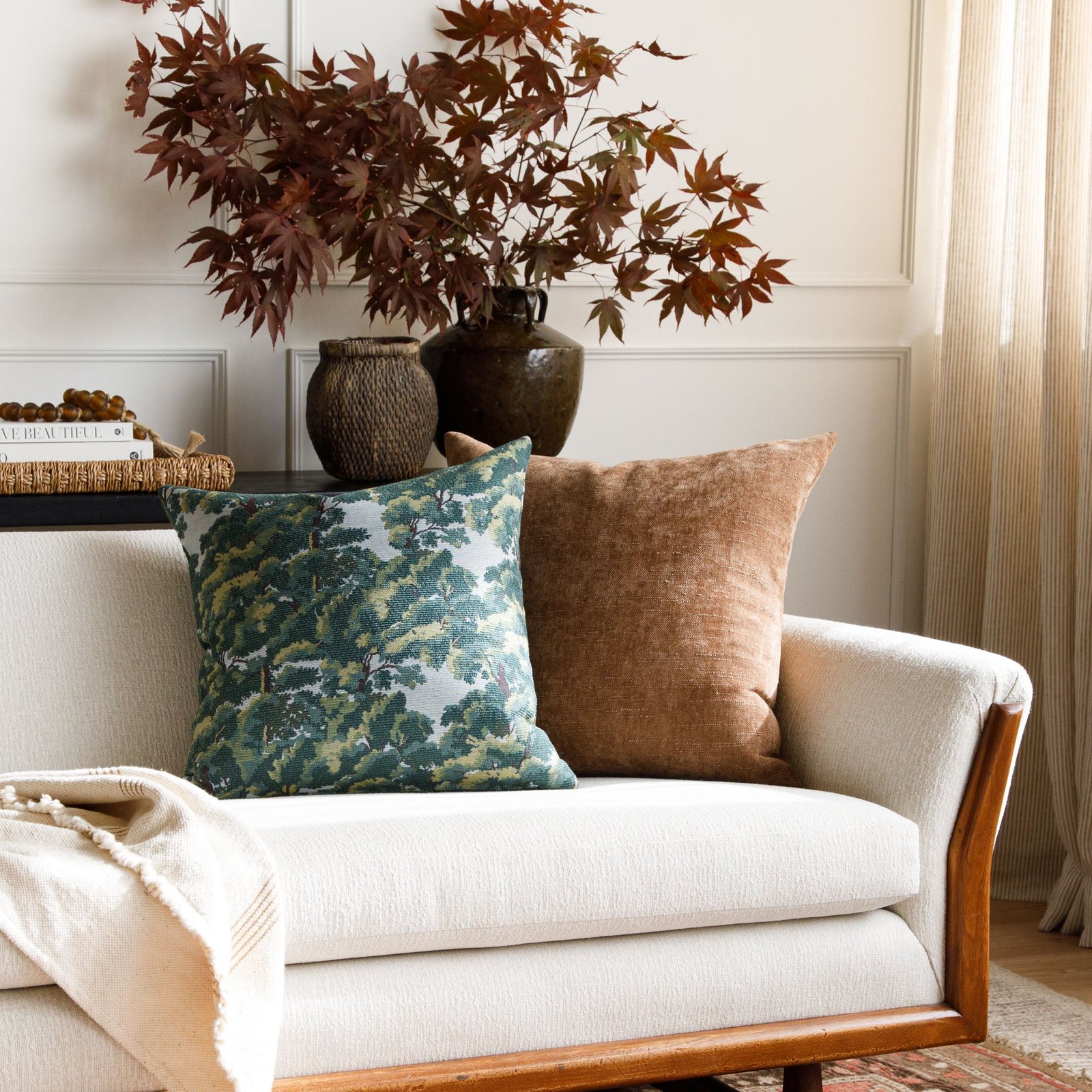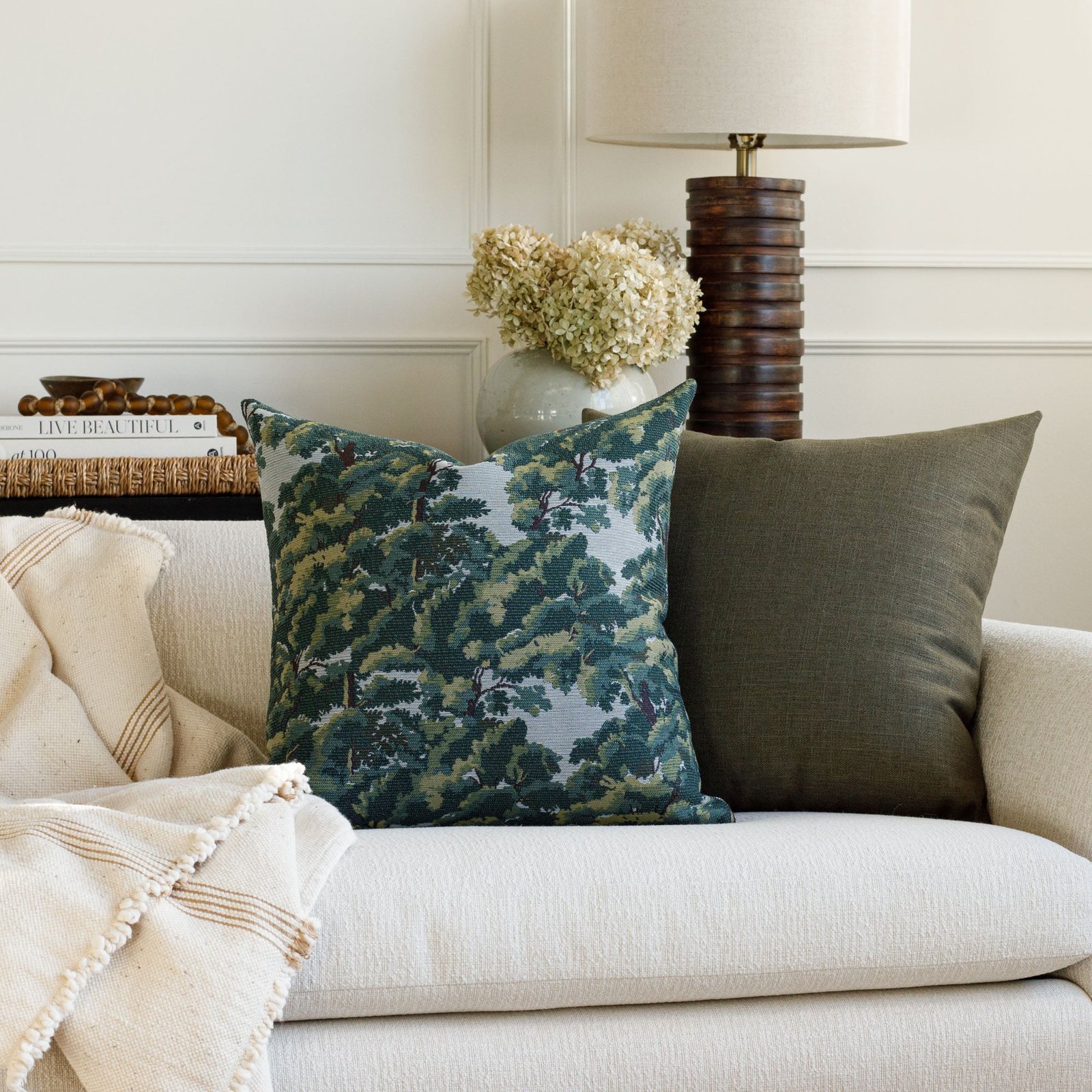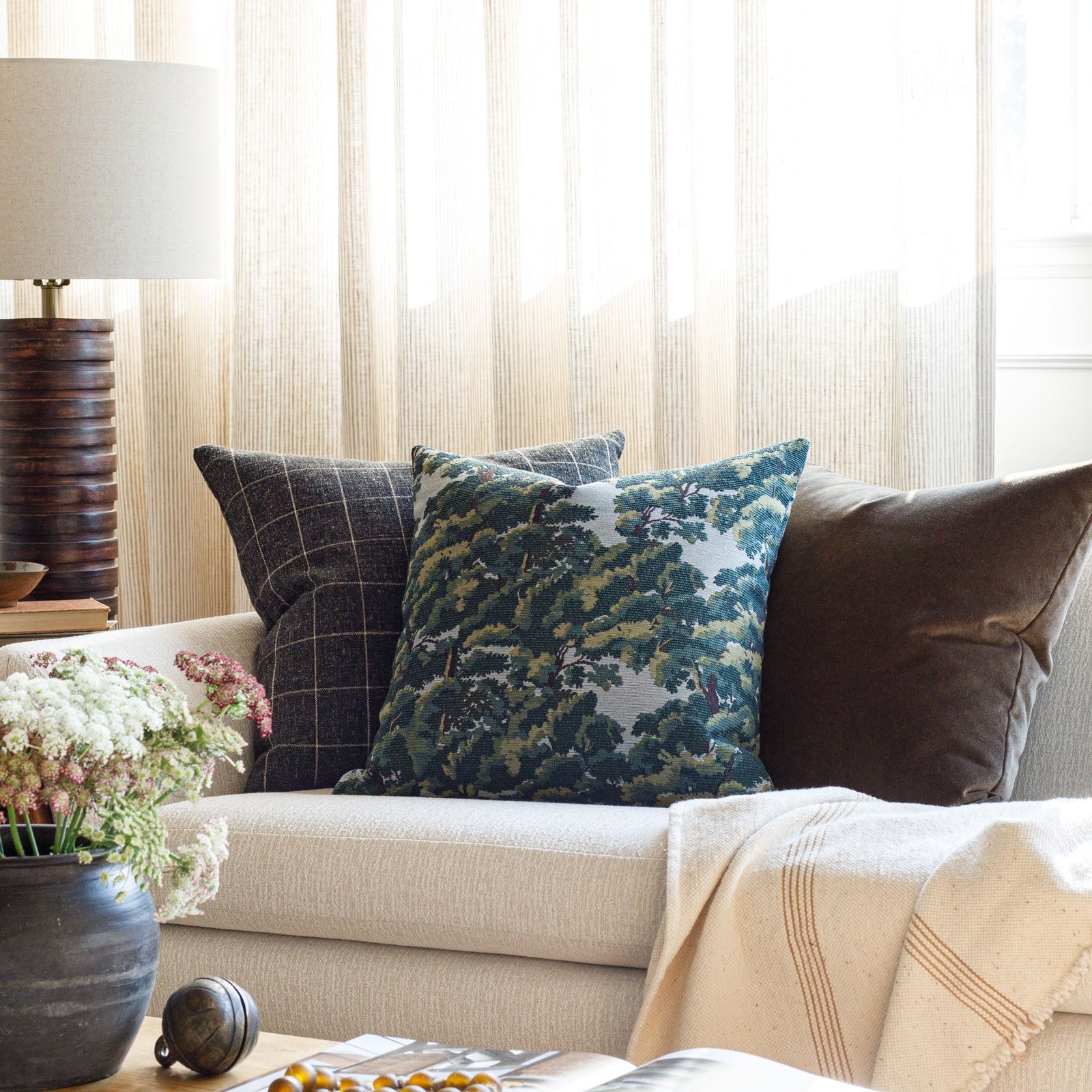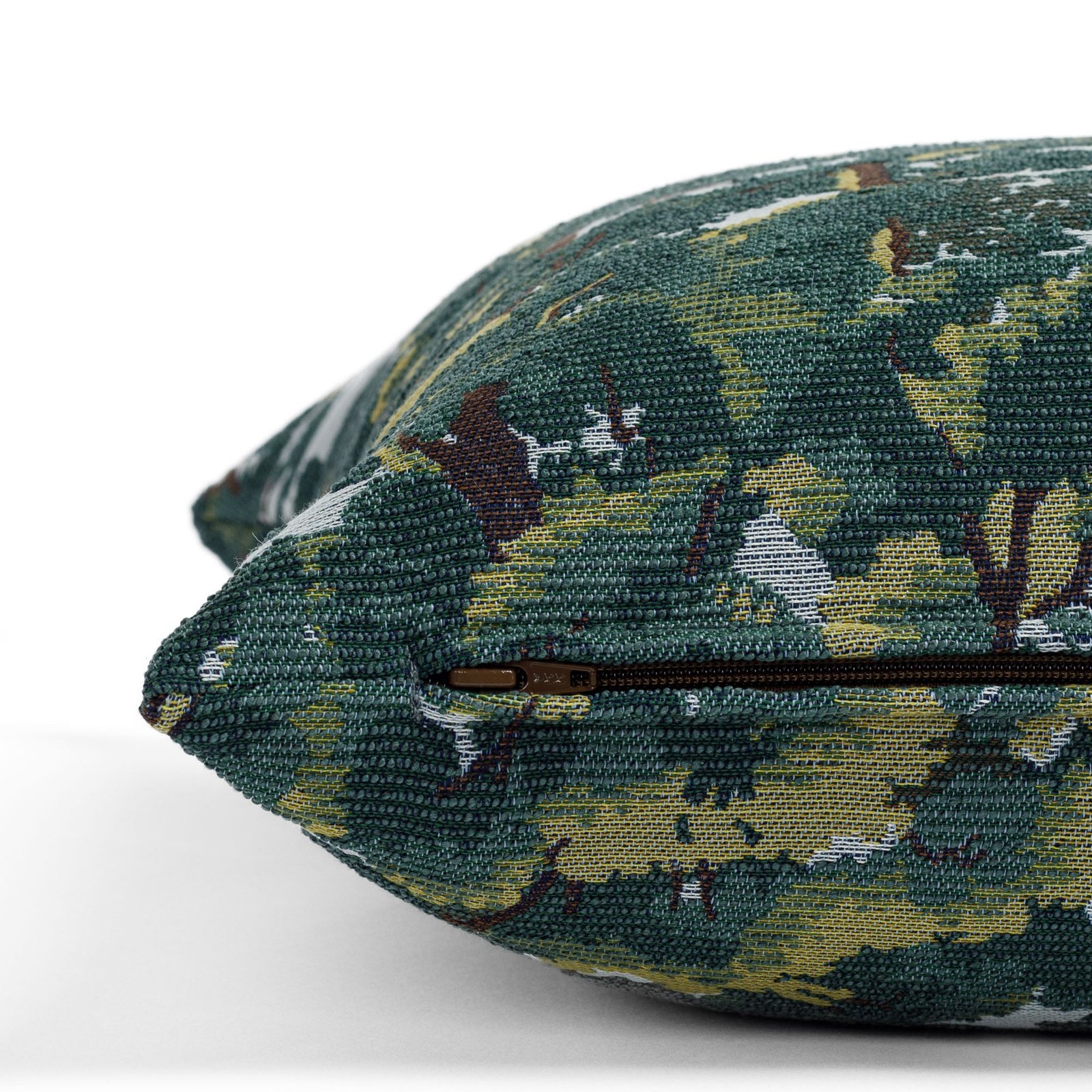 Welcome a touch of timeless elegance to your home with this stunning heritage-inspired pillow. With a pattern that evokes the rich history of a French chateau, this beauty showcases an earthy palette of deep forest green, bark brown, and hazy sky blue. The intricate woven motif, reminiscent of a well-loved tapestry, creates a visually stunning effect that will add depth and texture to your space – making it a perfect addition to your curated collection.