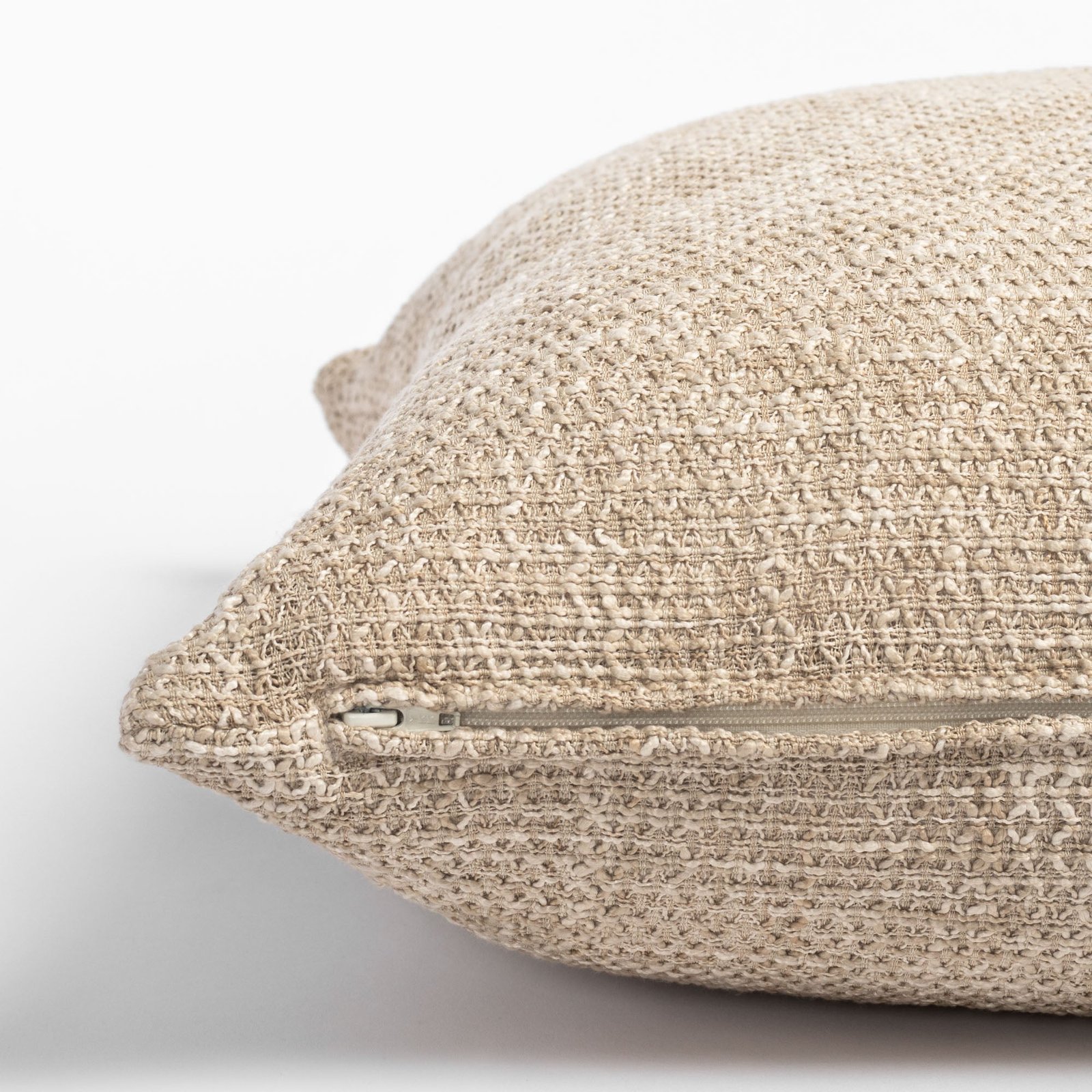 Texture is the name of the game here. This earthy flax toned pillow has a beautiful chunky woven texture with organic and natural variation reminiscent of a delicate, nubby macrame. It will be your new favourite goes-with-everything pillow!